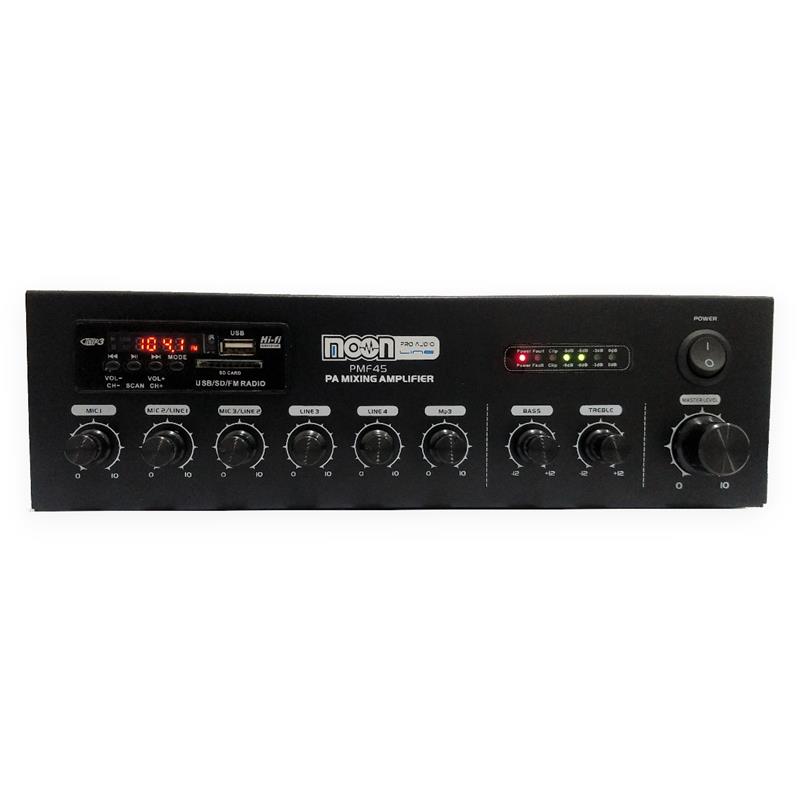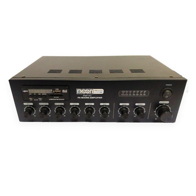 Mixer amplificado de 45w RMS que cuenta con: *Tres entradas de microfono con selector line/mic., una con coneccion xlr y dos con plug 6.5 con control de volumen.