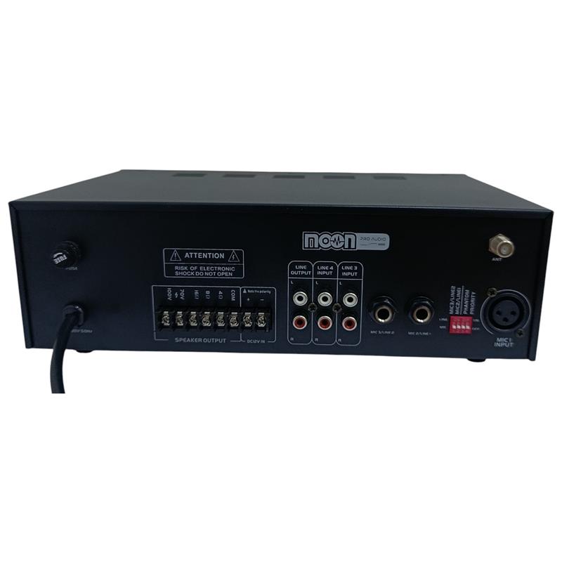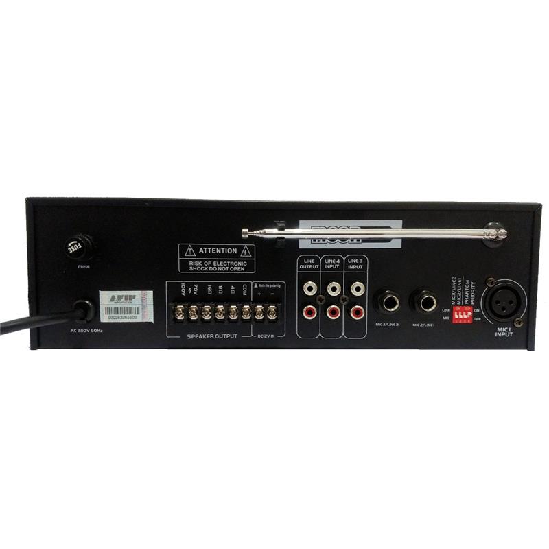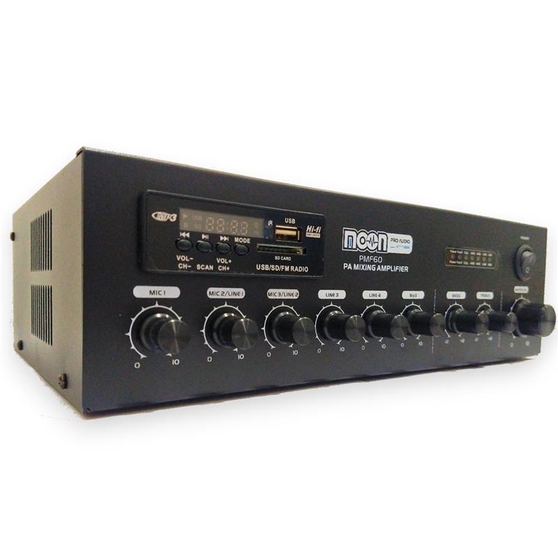 Mixer amplificado de 60w RMS que cuenta con: *Tres entradas de microfono con selector line/mic., una con coneccion xlr y dos con plug 6.5 con control de volumen.