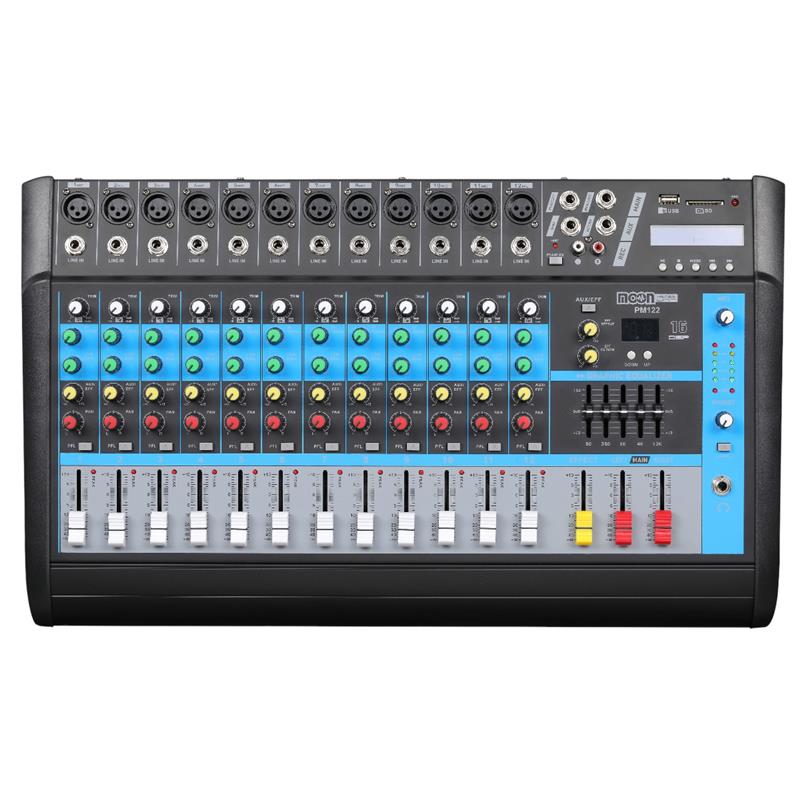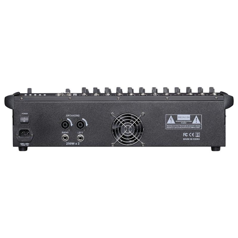 (*) Consola MOON de 12 canales, de 250W + 250W 4 Ohms. Canales de entrada MONO con entradas de línea XLR y balanceadas. Mic preamp con phantom +48v. Rango dinámico. AUX SEND por canal para monitoreo y efectos externos. Entradas balanceadas. Ecualizador de 2 bandas por canal. LED Peak en todos los canales. Función PFL. Display digital. Ecualizador gráfico de 5 bandas. De 220V
