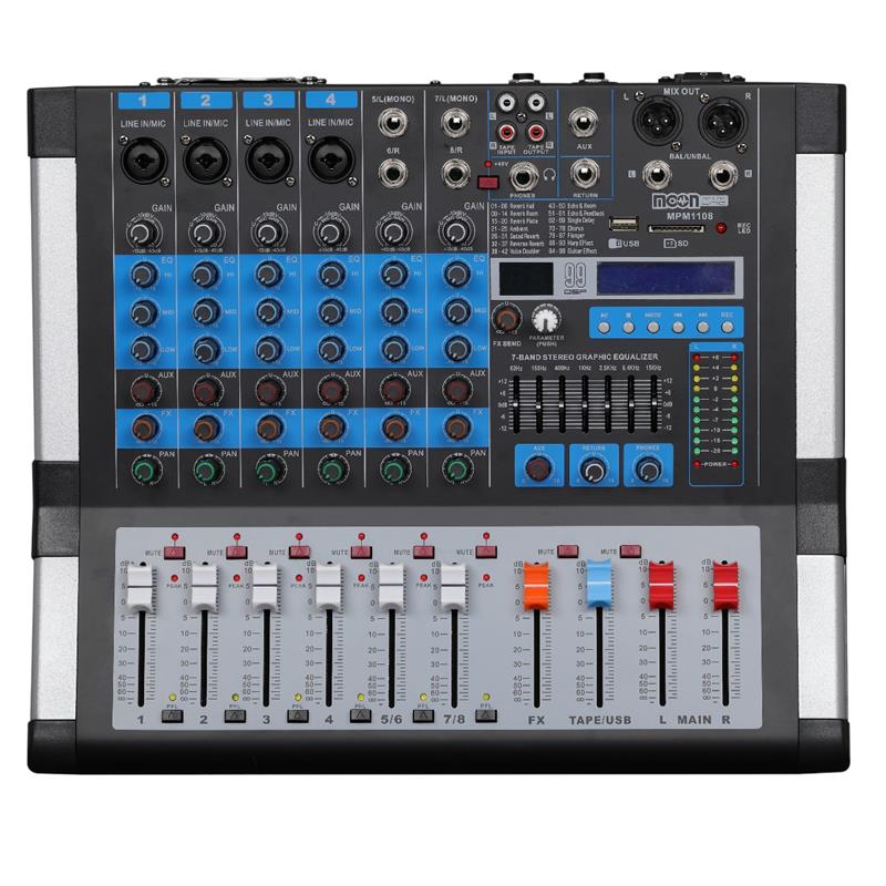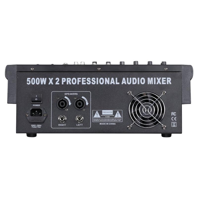 (*) Consola mezcladora de 8 canales (6 mono + 2 estéreo). Salida de potencia: 500w + 500w en 4 Ohms. Ecualizador de 3 bandas (alto, medio y bajo). Phantom. Ecualizador gráfico estéreo de 7 bandas. Procesador de efectos de 24 bits, 48KHz, 99 DSP. Con reproductor de MP3 compatible con todos los formatos de audio. Bluetooth. Función de grabación. De  220V