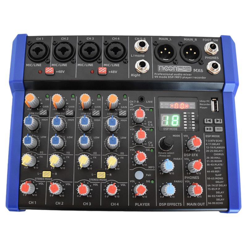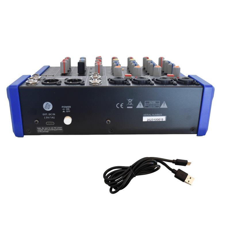 Mixer de seis canales con 99 efectos DSP 24 BIT 48KHZ, reproductor MP3, wireless, grabacion, interfase de audio USB y salida de master XLR. Cuatro entradas de microfono (XLR/TRS) con EQ 2 bandas, phanton y FX mas dos entradas estereo. Alimentacion via USB tipo C (INCLUYE CABLE). Respuesta de frecuencia: 20Hz-20KHz +/-1dB.