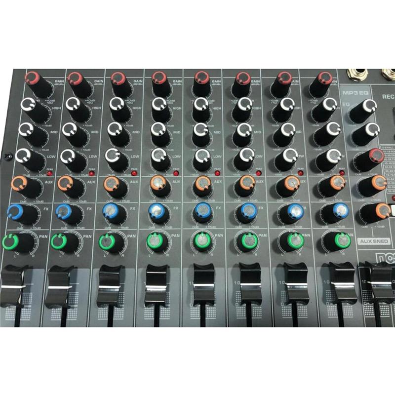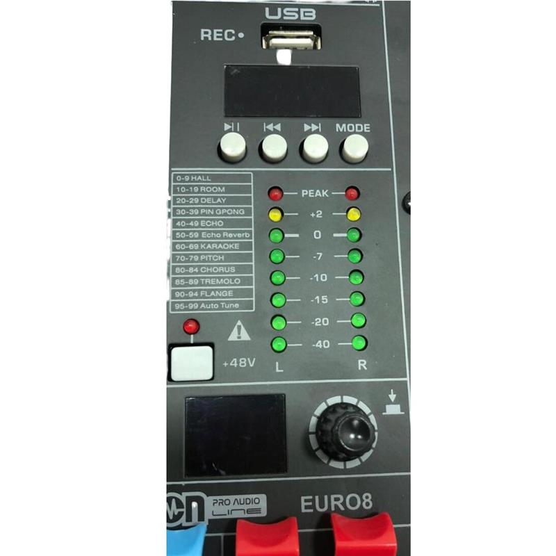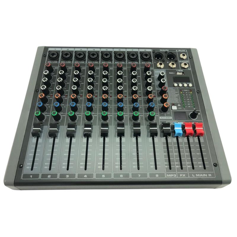 - 8 entradas XLR/TRS MIC/LINE con control de ganancia, indicador PEAK y volumen independientes