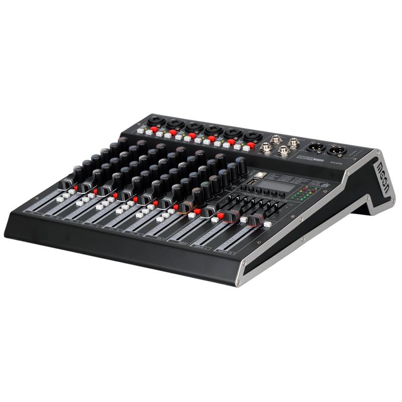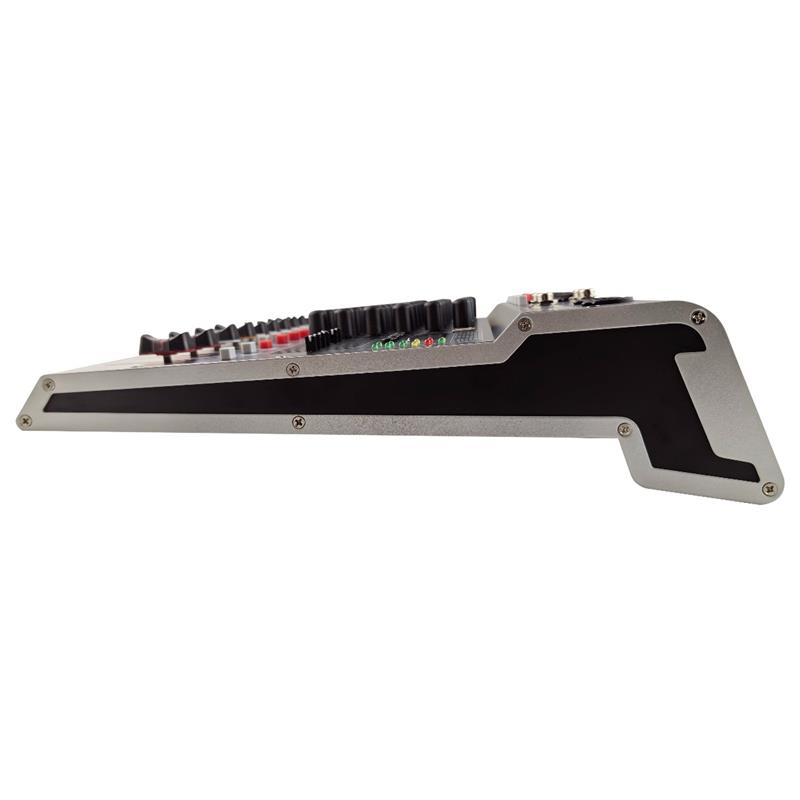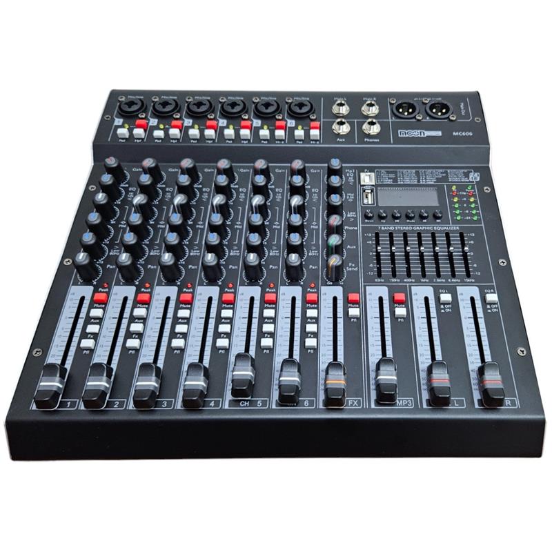 *6 entradas de microfono XLR/TRS con control de ganancia, Phanton 48v, HI-Z, LOW CUT, PAD, HPF, PFL, FX, AUX y MUTE