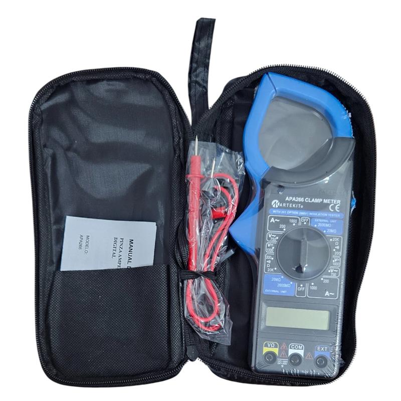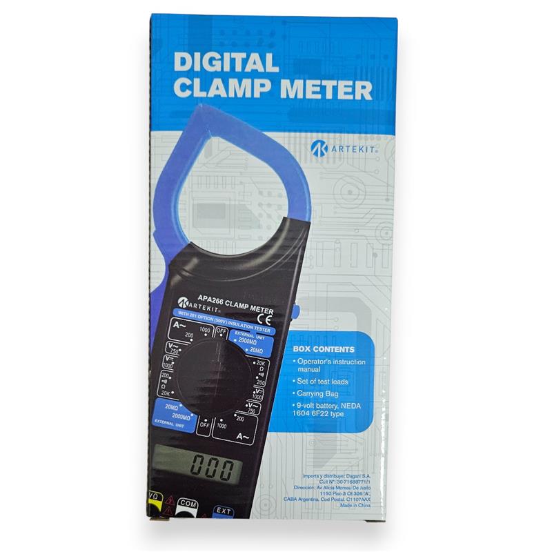 Pinza amperométrica. DCV: 1000V ±1.0%. ACV: 750V ±1.2%. ACA: 200-1000A ±2.0%. Resistencia: 200-20K? (20M-2000M?) ±1.0%. Tamaño LCD: 49x16mm. Max display:1999. Indicador de batería baja. Protección de sobrecarga. Test de continuidad del buzzer. Retención de lectura (HOLD). Batería: 1x9V 6F22 (no incluída). Tamaño del producto: 230×68×37mm. Peso: aprox. 202g (sin batería).