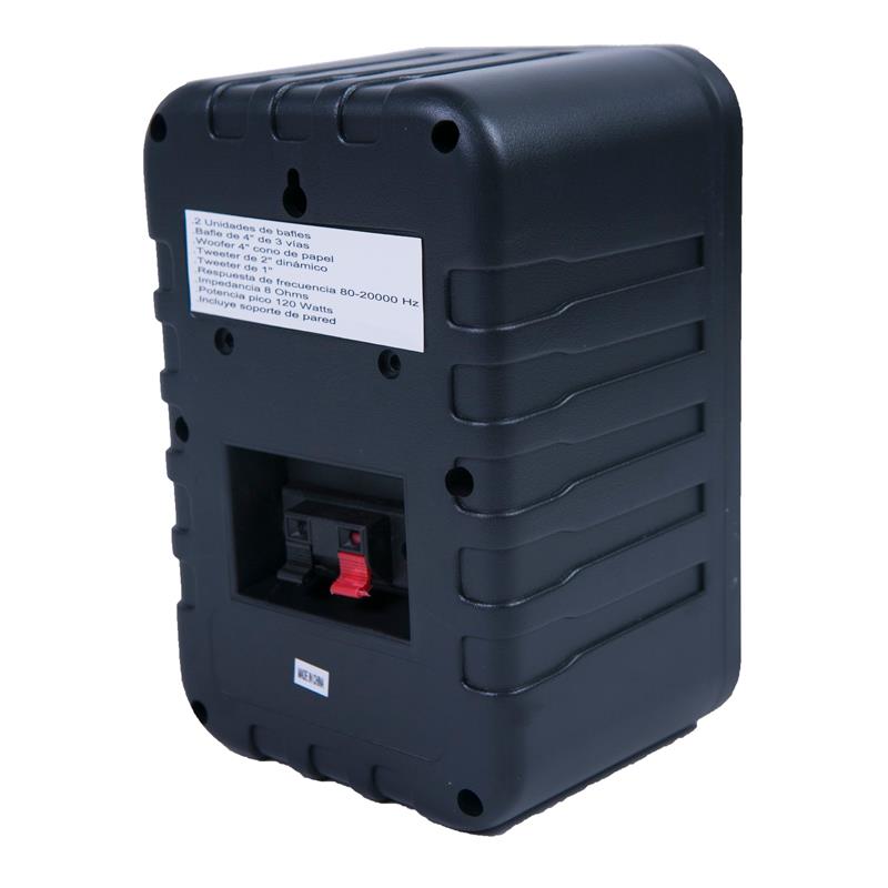 kit de instalacion con dos bafles NEGROS de tres vias con woofer de 4" 8 Ohm , tweeter de 2" dinamico y tweeter piezoelectrico de 1". Coneccion por bornera. Potencia pico 120 watts. Medidas: 26cmx23,5cmx15cm Peso: 2,38kg *PRECIO POR PAR*