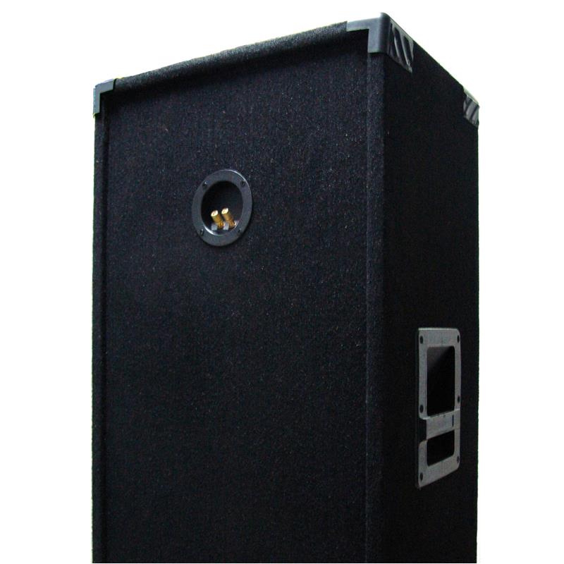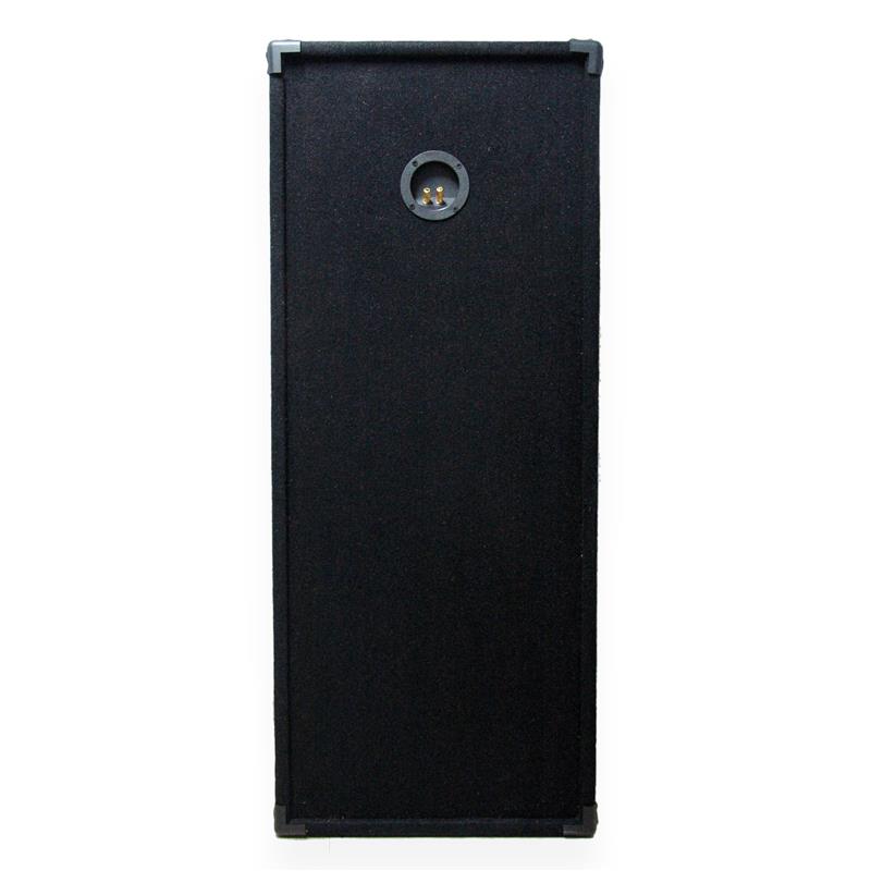 Bafle doble 15" reforzado con rejas metálicas, bocina piezoeléctrica y 4 tweeters piezoeléctricos, tubos de sintonía, manijas y bornera dorada. Potencia 200 WRMS. Medidas 120cm de alto x 50cm de ancho x 35cm de profundidad.