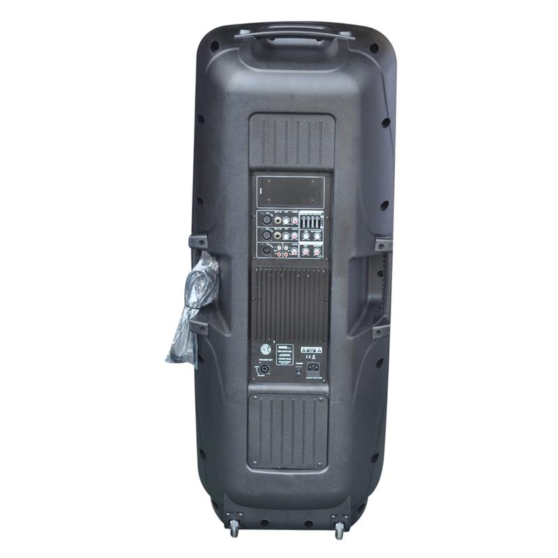 Bafle potenciado inyectado en color negro con dos woofer de 15", bobina de 2,5" de 8 Ohm y driver de titanio 34mm, dos entradas de microfono xlr balanceadas y jack 6,5 mono no balanceadas con control de volumen independiente y efecto,
