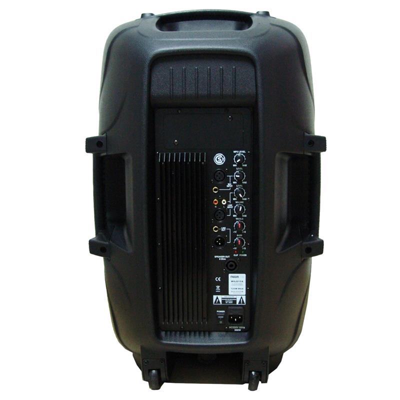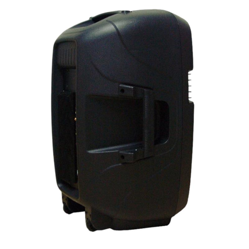 Bafle potenciado de 15" de dos vías con woofer de 15". 8 Ohms, bobina de 2,5" y driver de titanio de 44mm. Cuenta con entradas de microfono (XLR/ Jack 6,5), salida (XLR/JACK 6,5) y entrada (XLR/ RCA) de linea, control de tono y salida Speakon. Cod. 745125573519