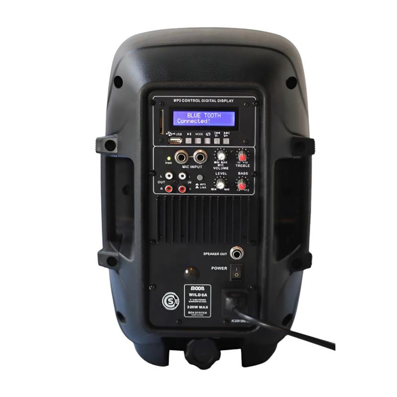 Bafle potenciado de 8" de dos vías con radio, mp3, USB, SD y bluetooth. Woofer de 8". 8 Ohms, bobina de 1,5" y driver de titanio de 25mm. Cuenta con entradas de microfono (Jack 6,5), salida y entrada (RCA) de linea, control de tono y sal
