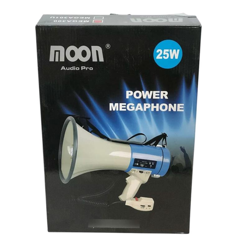 Megafono MOON con puerto USB, tarjeta SD y entrada auxiliar. de 25 watts. No incluye 8 batería C. Alcance al aire libre: hasta 1500m. Dos efectos sonoros (sirena y silbato). De 230mm de diámetro x 350mm de largo.