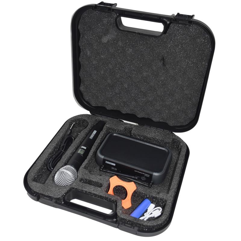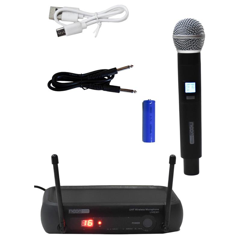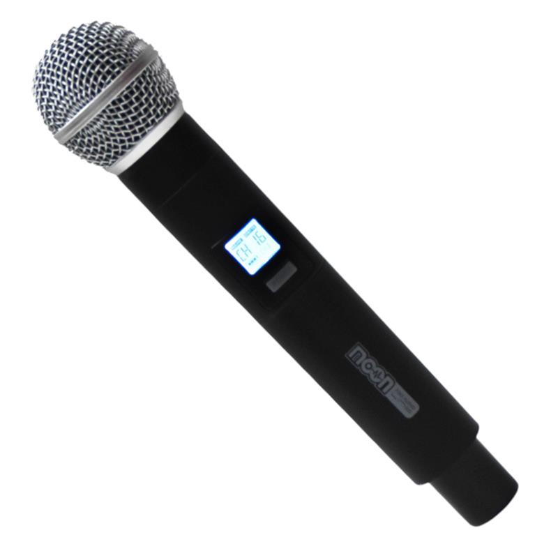 Sistema de microfono inalámbrico de mano UHF con 20 canales seleccionables y microfono con bateria recargable.