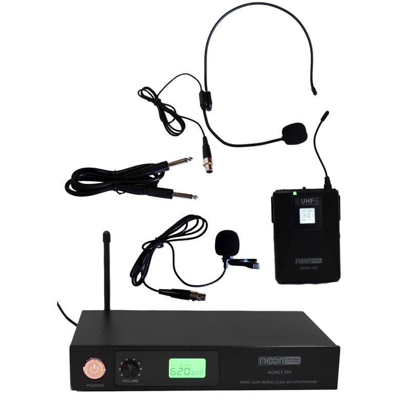 Sistema de microfono inalambrico UHF con bodypack, diaplay LCD y 50 canales seleccionables.