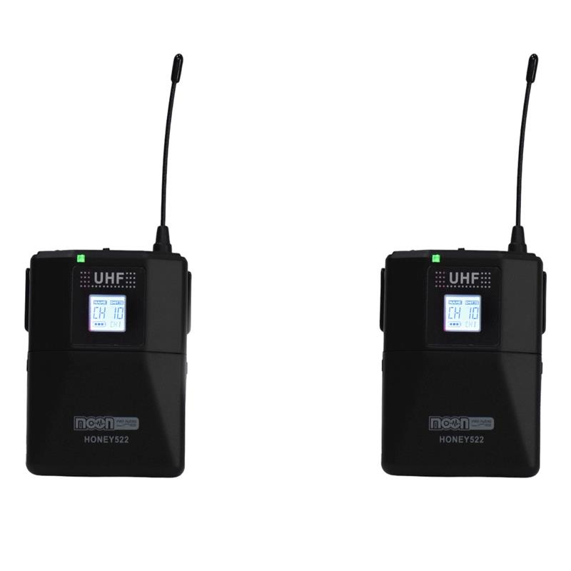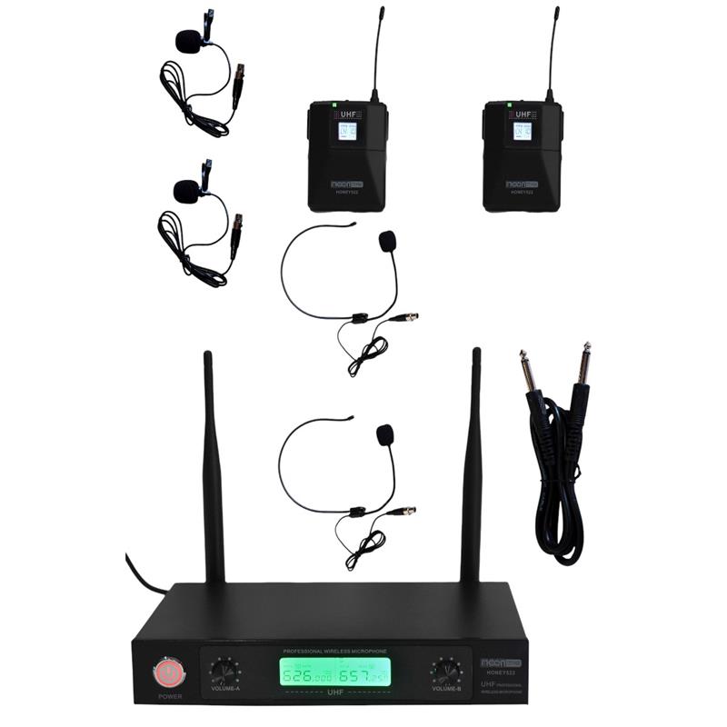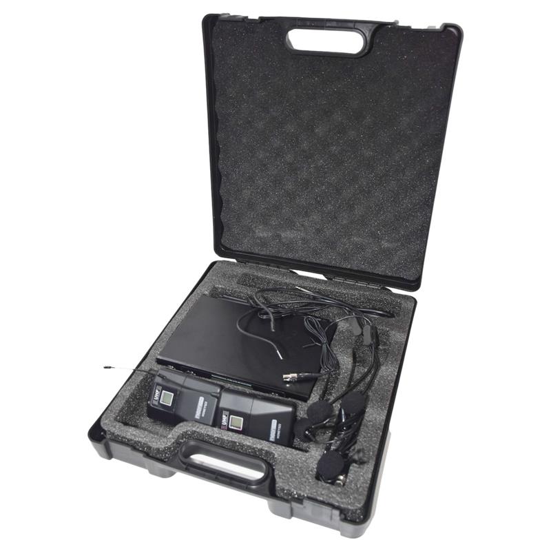 Sistema de microfono inalambrico UHF doble con bodypacks, diaplay LCD y 50 canales seleccionables.