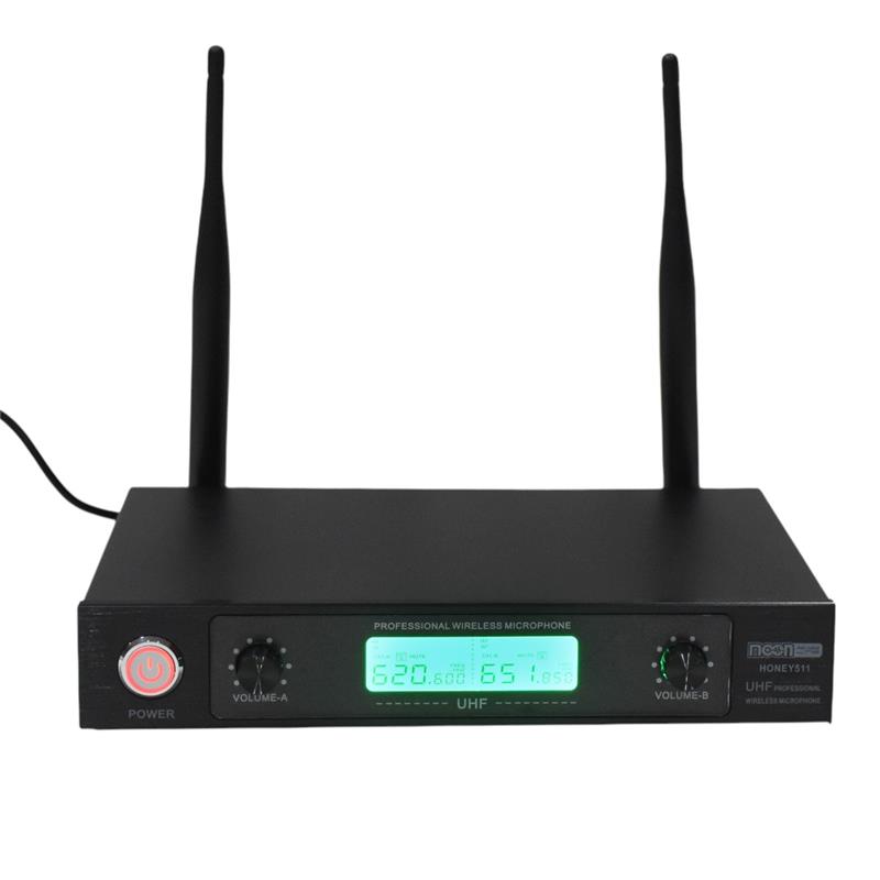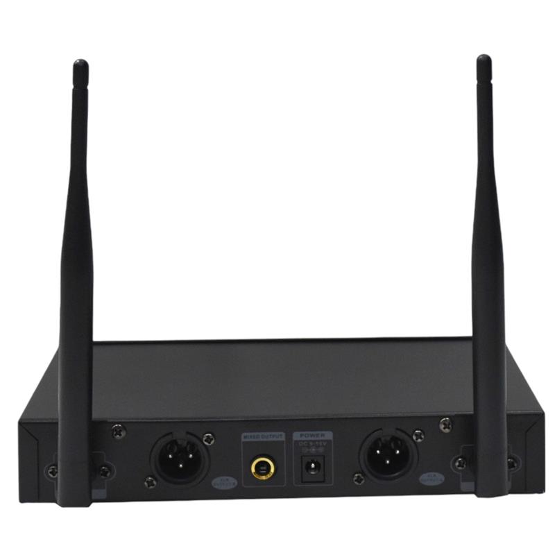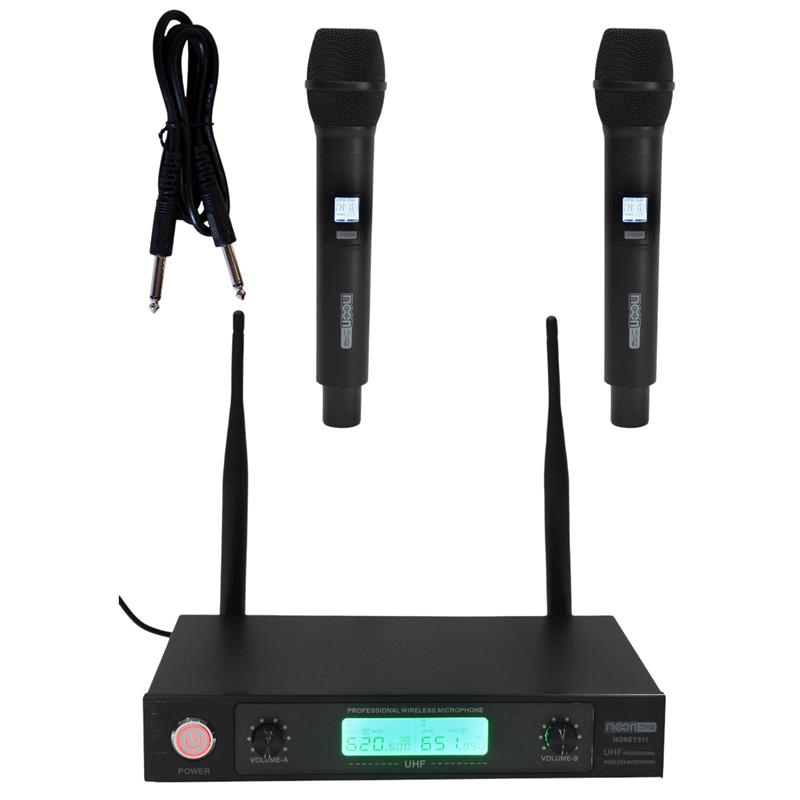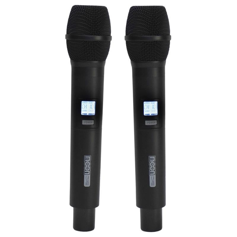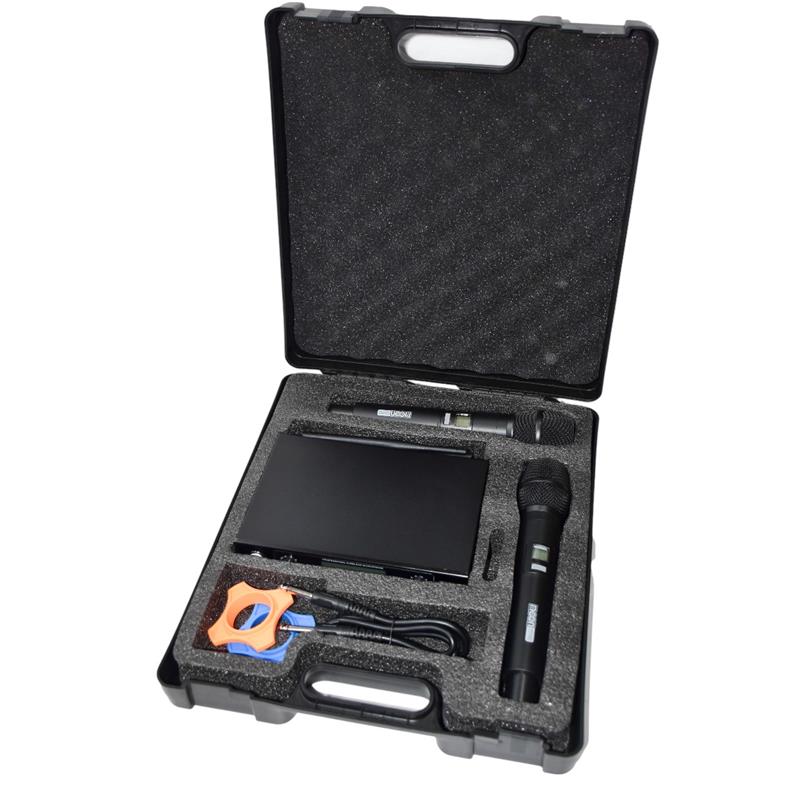 Sistema de microfono inalambrico UHF doble de mano con display LCD y 50 canales seleccionables.
