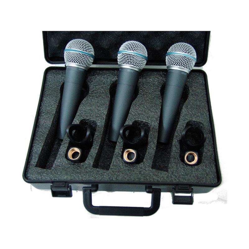 Pack de tres micrófonos dinámicos cardioide. Unidireccional. Respuesta de frecuencia: 40-15.000Hz. Sensibilidad: -56.0 dBv/Pax (1.6mV). Con conector canon macho. Cod. 7567890125365